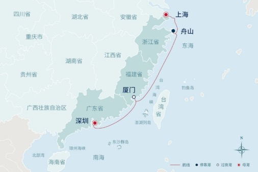 另一条2023年航线是“东南海岸文化之旅”(深圳-厦门-舟山-上海 / 上海-舟山-厦门-深圳),目前已入选交通运输部公布的“国内水路旅游客运精品航线”。该航线将从深圳或上海出发,途中探游“海上花园”厦门及“海天佛国”舟山,从趣味人文到深度佛教艺术、从市井繁华到世界非遗,以全新角度呈现中国海岸的旖旎风光与人文风情。