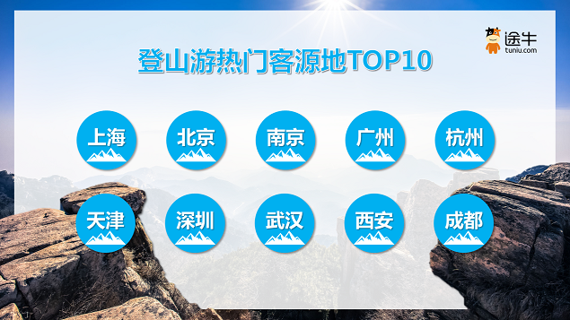途牛截至目前最新预订数据显示,2023年以来,选择登山游相关旅游产品的用户出游人次占比达29%,是途牛用户最热衷的出游主题之一。其中,上海、北京、南京、广州、杭州、天津、深圳、武汉、西安、成都等地用户对登山游拥有更高的热情。