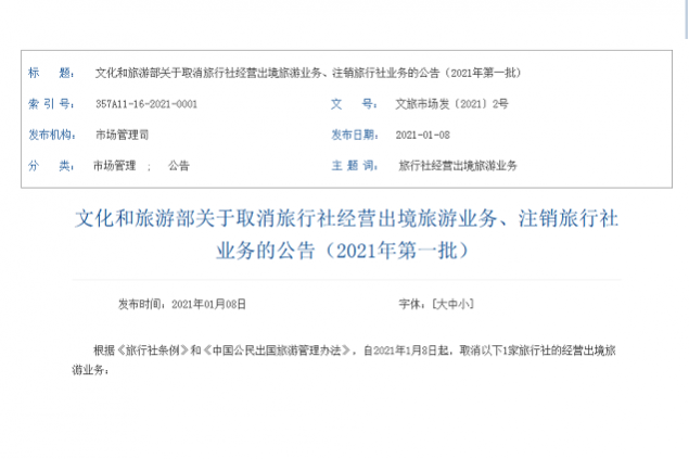 1月14日,文旅部发布公告,根据《旅行社条例》和《中国公民出国旅游管理办法》,自2021年1月8日起,取消延边新晟国际旅行社有限公司的经营出境旅游业务,注销云南世博国际旅行社有限公司、珠海中国国际旅行社有限公司、宝钢集团上海国际旅行社有限公司3家旅行社的旅行社业务。